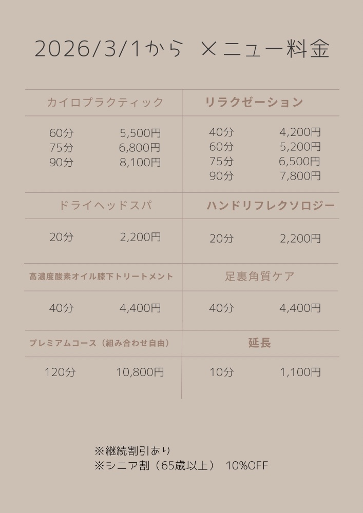 このたび、サービス品質のさらなる向上と、より心地よい施術時間をお届けできるよう、2026年3月1日より、メニュー内容の見直しおよび料金の調整を行うことになりました。