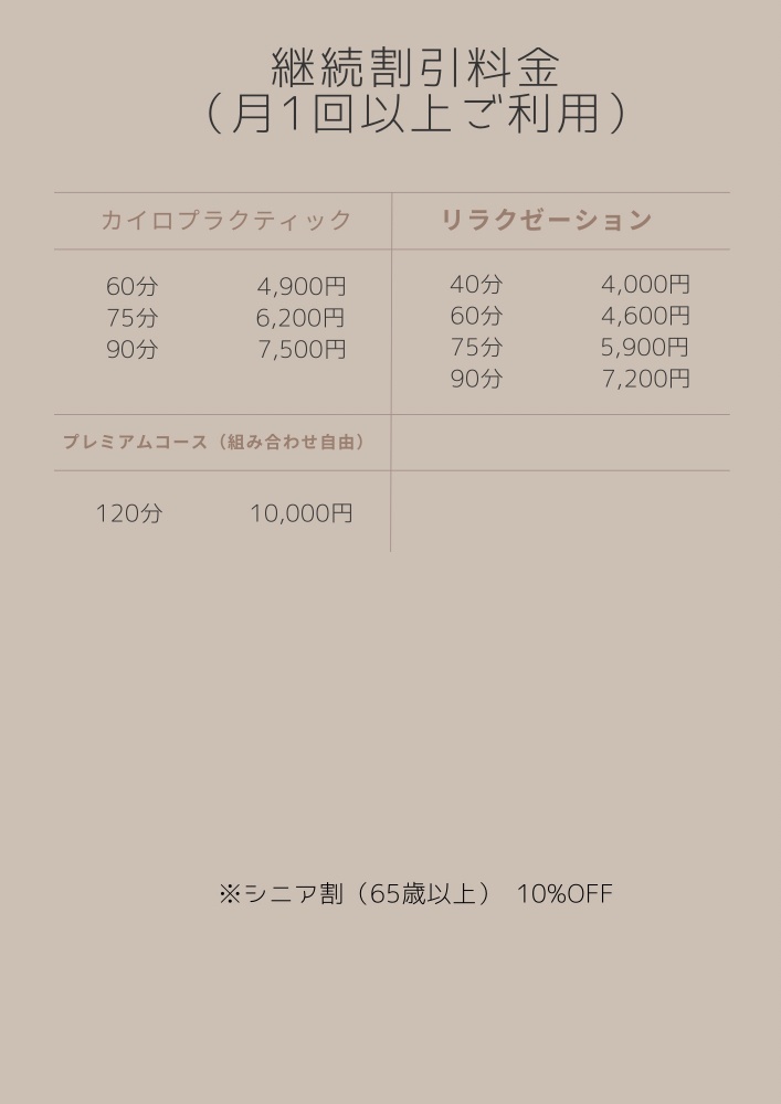 カイロプラクティック・リラクゼーションサロンです。肩こりや腰痛、自律神経ケア、姿勢改善など、お気軽にご相談ください。